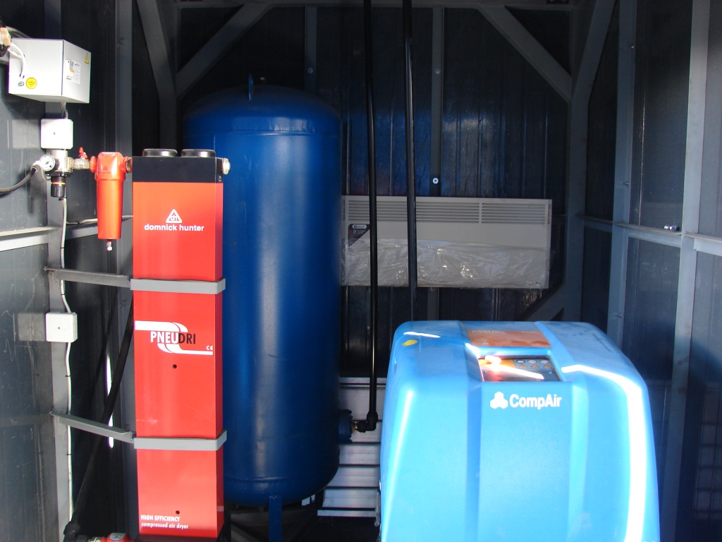 Компрессорная установка, встроенная в рукавный фильтр, в стандартной комплектации состоит из компрессора, осушителя и ресивера.