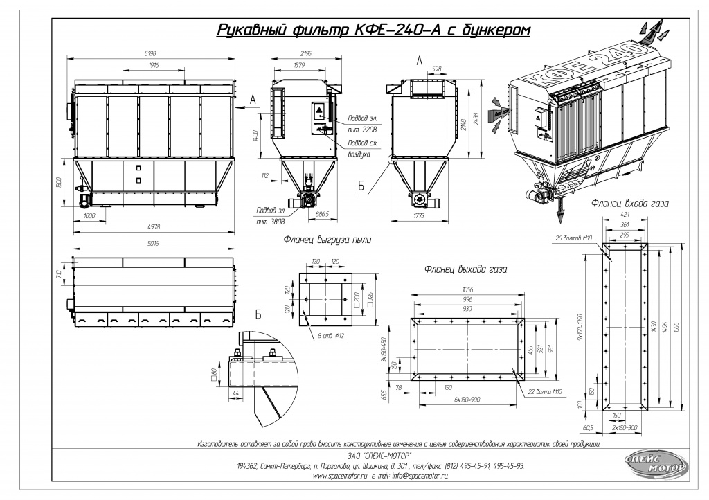 Над дверью, для удобства обслуживания установлен блок с импульсными электромагнитными клапанами. Фланец входа расположен слева сбоку, фланец выхода расположен справа сверху.
