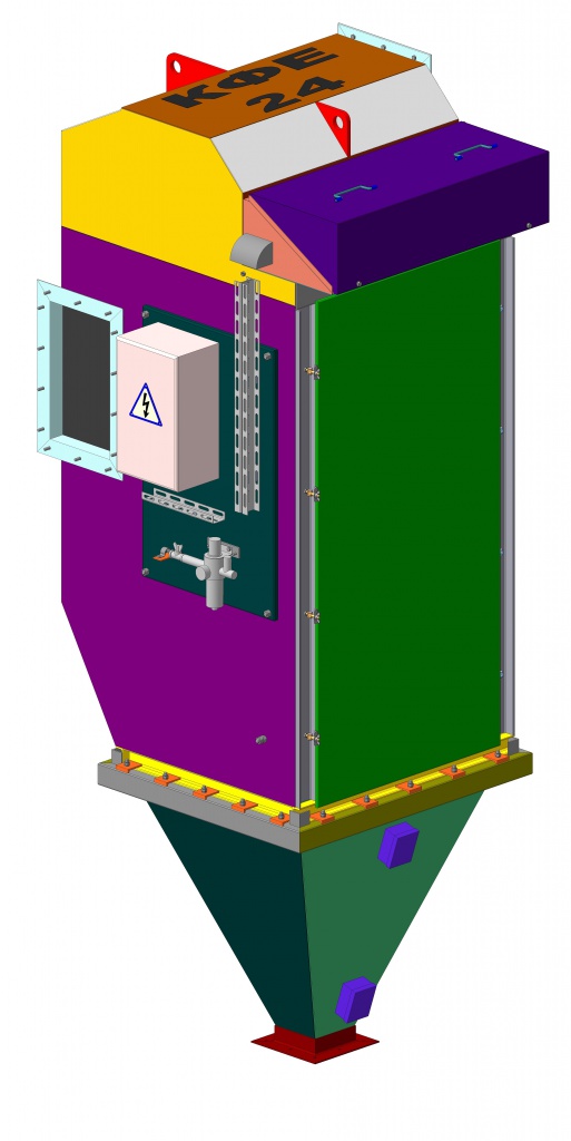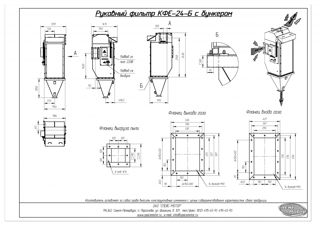 Над дверью для удобства обслуживания установлен блок с импульсными электромагнитными клапанами. Фланец входа расположен слева сбоку, фланец выхода расположен справа сверху.