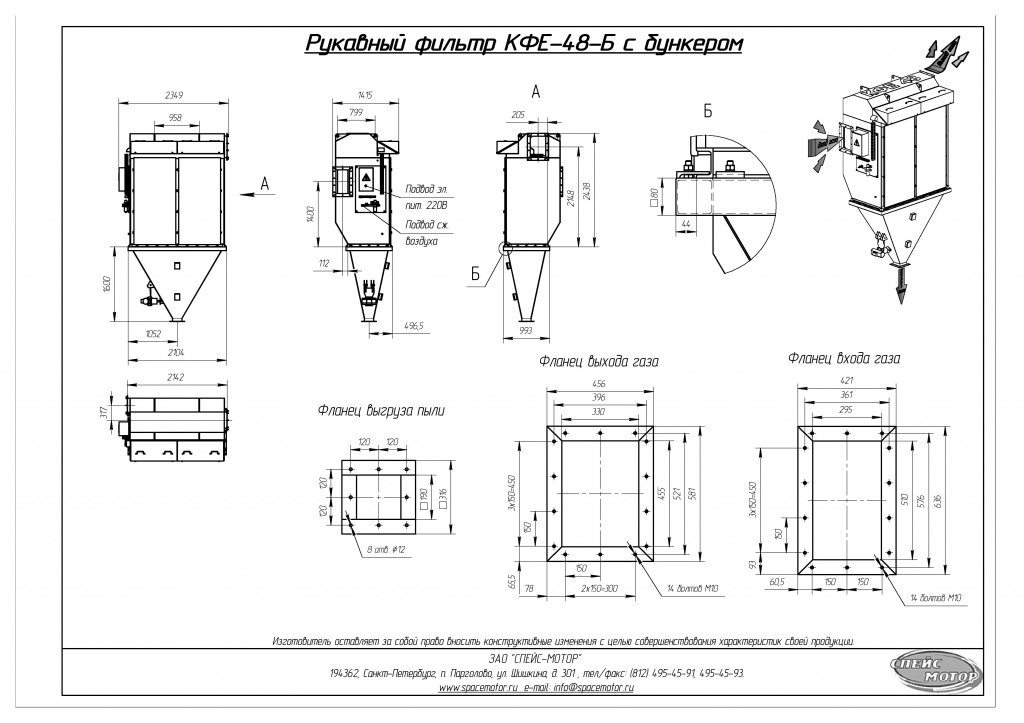 Над дверью для удобства обслуживания установлены два блока с импульсными электромагнитными клапанами. Фланец входа расположен слева сбоку, фланец выхода расположен справа сверху.
