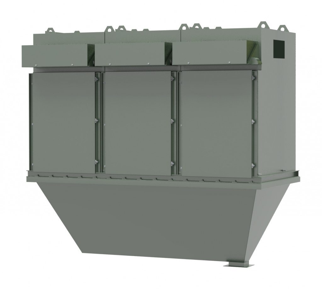 Под корпусом фильтра смонтирован подрукавный бункер – либо пирамидальной формы, либо со съемным шнековым транспортёром. Конфигурация подрукавного бункера определяется по согласованию с заказчиком. К нижнему выгружному фланцу бункера могут быть смонтированы дополнительные элементы пылевыгрузки – задвижка пылевая, питатель шлюзовый, мигалка.