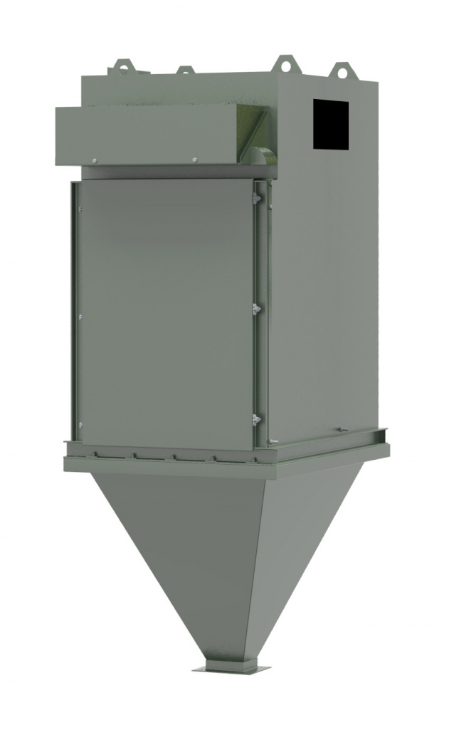 Под корпусом фильтра смонтирован подрукавный пирамидальный бункер без шнека. К нижнему выгружному фланцу бункера могут быть смонтированы дополнительные элементы пылевыгрузки – задвижка пылевая, питатель шлюзовый, мигалка.