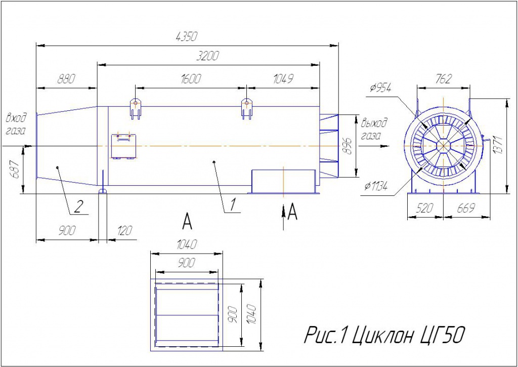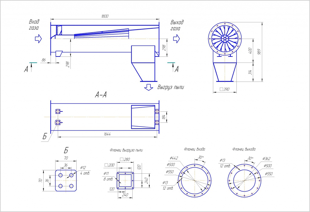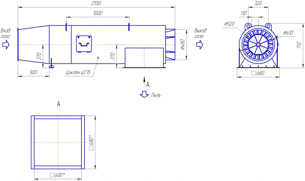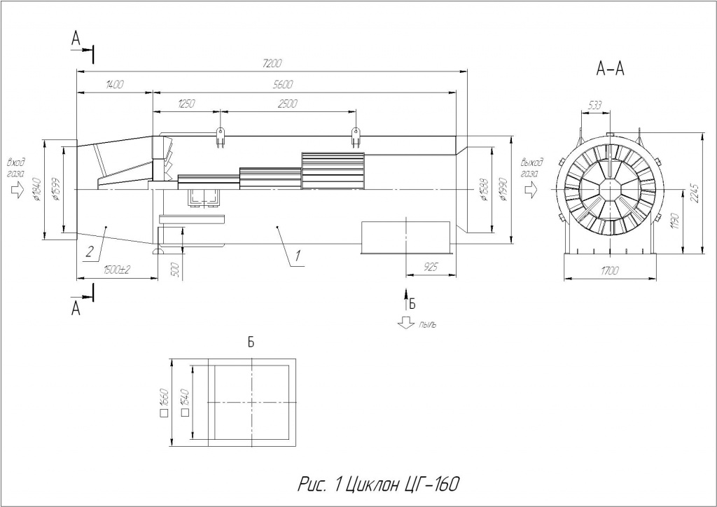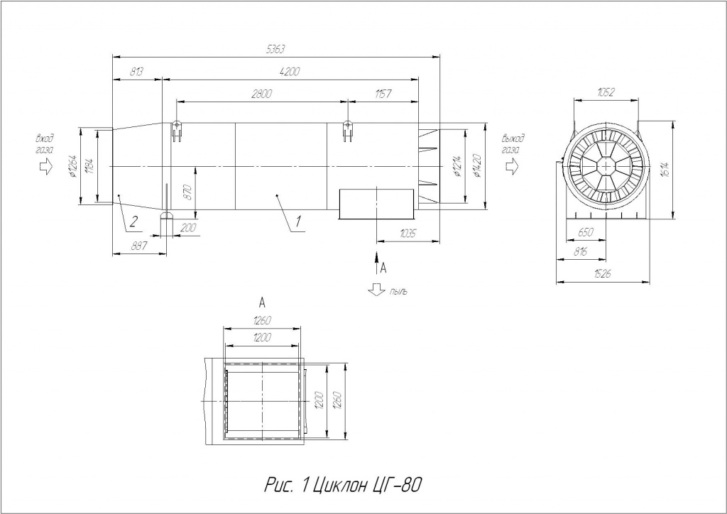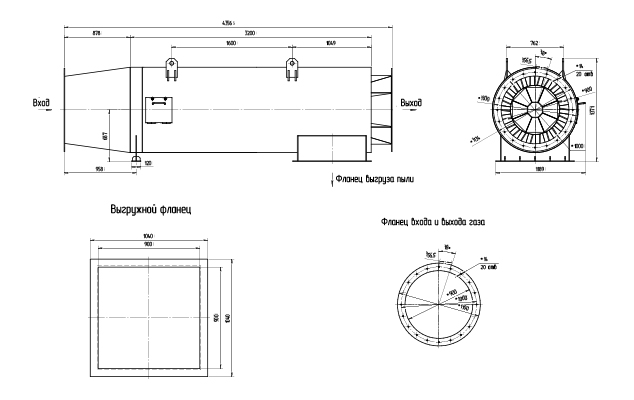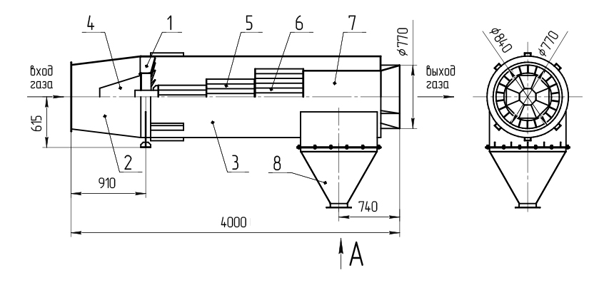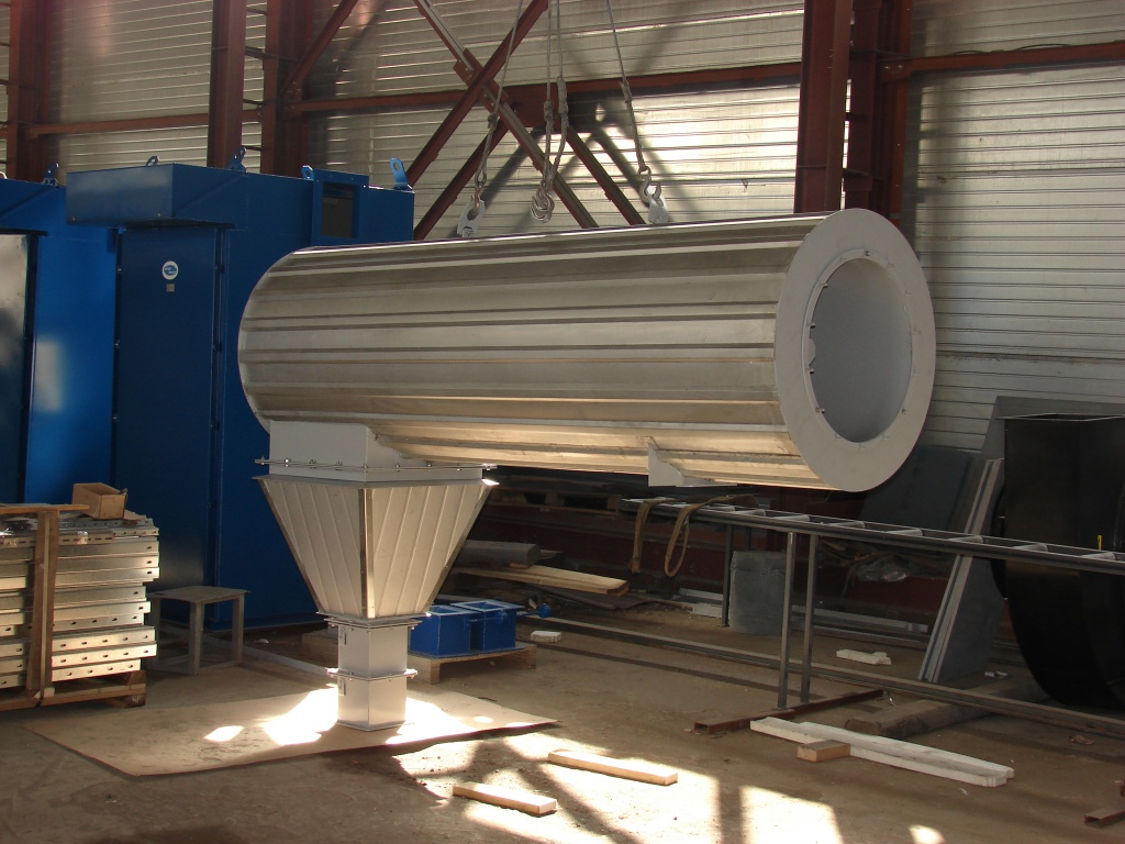 Горизонтальный циклон не требует отдельного места, так как монтируется на газоходе перед рукавным фильтром. Его горизонтальное расположение позволяет подсоединить к нему бункер-пылесборник вертикально внизу.